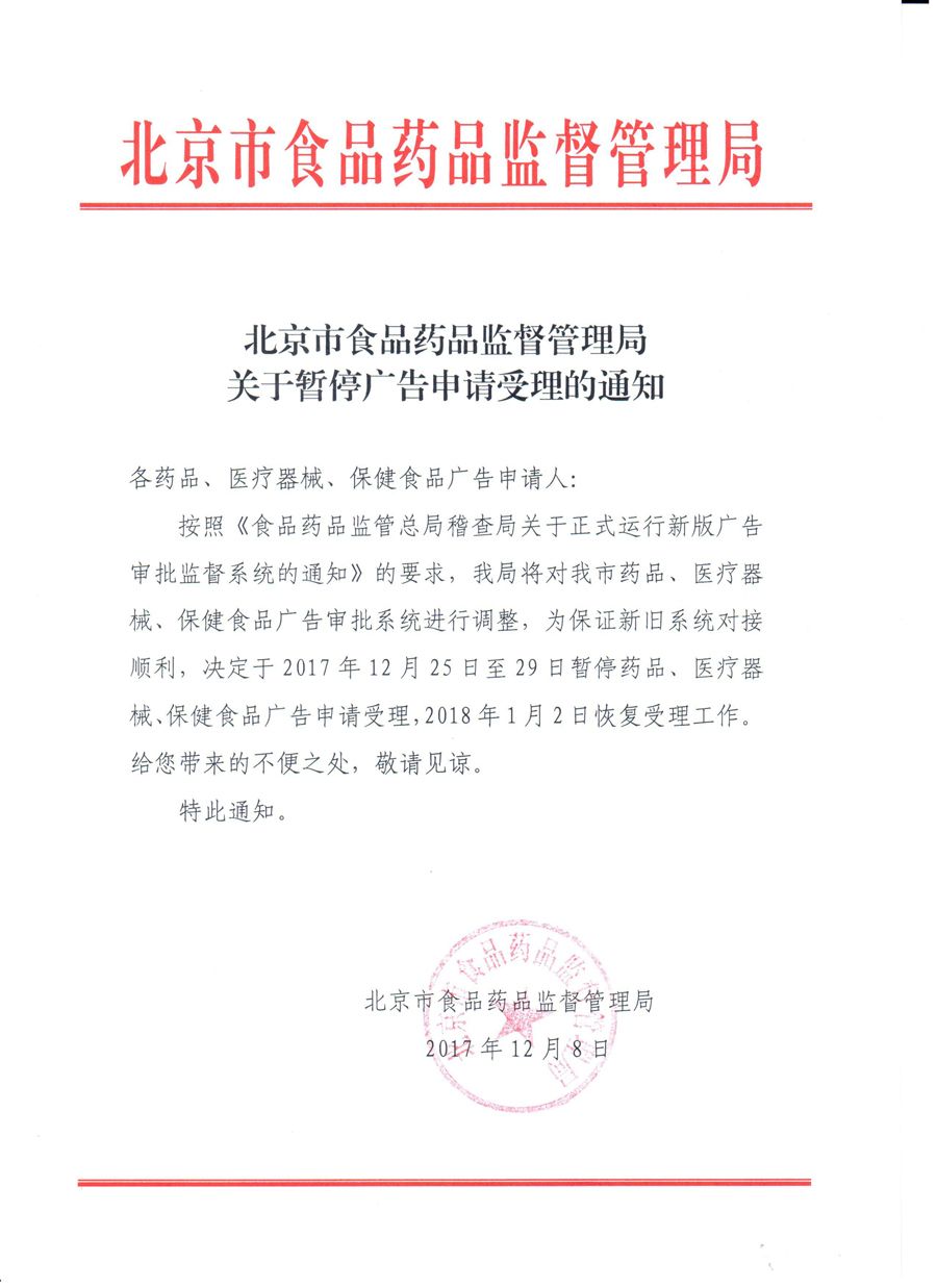 北京市食品药品监督管理局关于暂停广告申请受理的通知