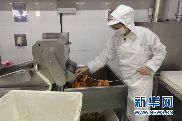 图为,在护国寺小吃配送中心炸货区域,工作人员正在串炸好的焦圈。(新华网 李楠 摄)