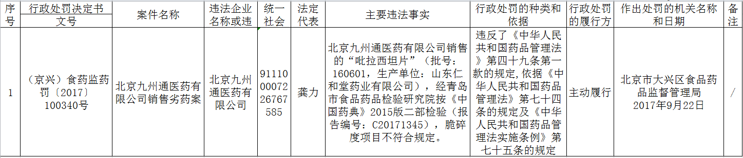 大兴食药局2017年下半年打击侵权假冒行政处罚案件信息公开表